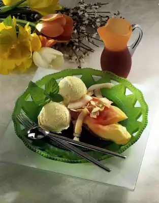 Cut the papaya in half, remove the seeds, quarter and carefully peel. Cut the flesh into pieces. For the sauce, heat jelly, add lemon and cherry nectar. Arrange papaya slices, 2 scoops of ice cream and some sauce on plates. Sprinkle with coconut chips and serve decorated with mint