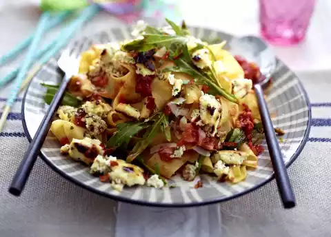 Wash and clean the rocket and pat dry well. Drain the noodles and let them drain. Season sauce again. Mix noodles with sauce and rocket. Arrange on plates. Sprinkle with parmesan and crumbled ricotta. Serve immediately