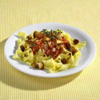 Add the tomatoes and canned tomatoes, crush and simmer gently for about 10 minutes. Season with salt and pepper. In the meantime clean the chanterelles, clean and possibly halve them. Add the chanterelles to the tomato sauce and cook with it.