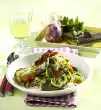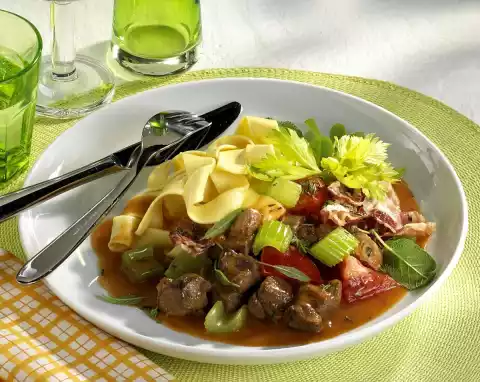 Fry meat, garlic and onions in the bacon fat. Season with salt and pepper. Stir in tomato paste, dust with flour. Add red wine and 3/4 litre water while stirring. Cover and stew for about 50 minutes. In the meantime, clean and wash the celery and tomatoes and cut them into small pieces. Wash and chop the herbs. Add vegetables, herbs and 1/4 of the bacon to the pot after 20 minutes. Cook the pasta in boiling salted water for about 8 minutes.