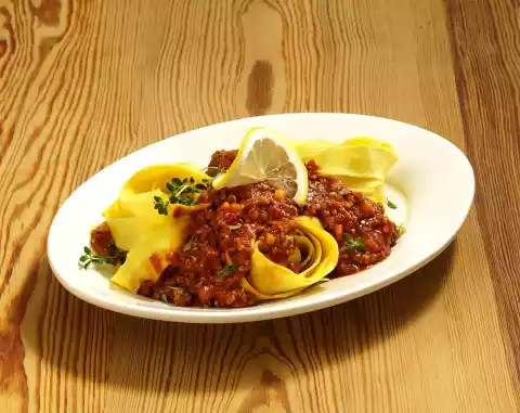 Add tomato paste and minced meat and fry until crumbly. Add onion and garlic and sauté. Deglaze with lemon juice and chunky tomatoes and simmer for about 10 minutes. In the meantime prepare noodles in boiling salted water according to package instructions. Wash the thyme and shake dry. Pluck the leaves from the stalks, except some for garnishing. Season sauce with salt, pepper and 1 pinch of sugar. Add thyme to the sauce and stir in. Arrange pasta and lemon bolognese on plates.