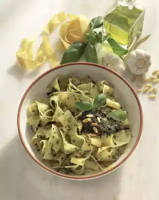 Lightly roast pine nuts in a pan without fat. Peel garlic, pluck basil leaves from the stalks and wash. Cut Parmesan cheese into pieces. Finely chop all ingredients in the universal chopper. Stir in olive oil.