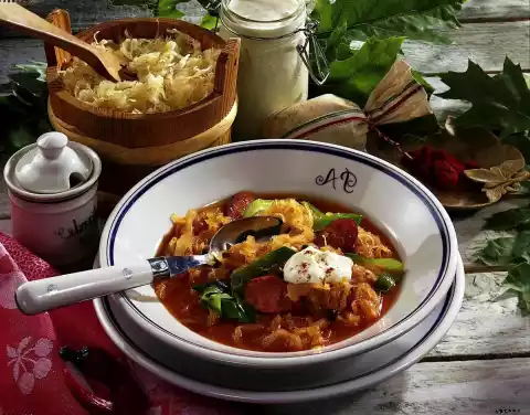 Cut the sausages into slices and heat them in the soup. Season with salt, pepper, paprika and sugar. Arrange on plates with 1 blob of crème fraîche