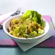 Mix with the mustard. Add vinegar and finally add the oil drop by drop. Season to taste with salt, pepper and sugar. Crumble the feta cheese into small cubes and carefully fold into the salad.