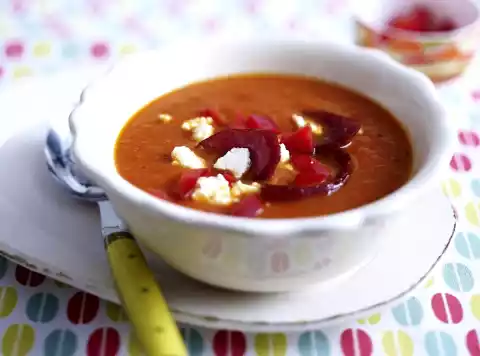Add cabanossi and paprika cubes, bring to the boil. Arrange soup, sprinkle with feta.