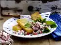 Drain the roasted peppers. Peel onions and garlic and dice finely. Cut Cabanossi into slices.