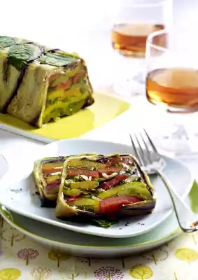 Halve the peppers, peel, core and cut into thick strips. Line a tureen mould (or box mould; approx. 10 x 25 cm) with cling film. Place about 4 basil leaves on the bottom. Line the mould with aubergine strips. Layer bell peppers, basil leaves and spring onions. Fill up with stock and cover with cling film. Put some weight on the surface and chill for at least 6 hours