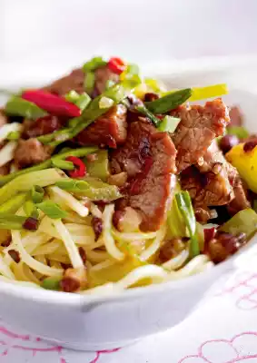 Sauté the bell peppers, spring onions, garlic, chilli and beans in the frying fat for about 2 minutes, stirring continuously. Add 1 tablespoon of rice wine. Season with salt, pepper and 1 pinch of sugar. Drain the noodles and mix with the paprika beef.