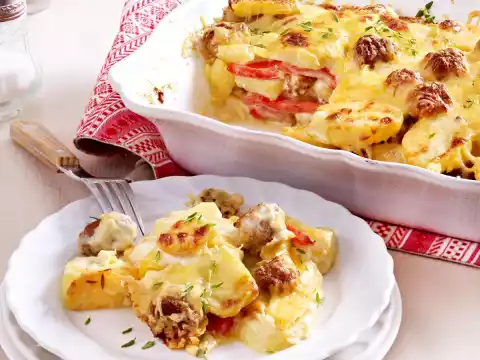 Place a layer of potatoes in a casserole dish, then cover with a layer of paprika, spread 1/4 of the meatballs on top, pour half of the sauce over it and repeat the whole thing again. Cover with the remaining potatoes and dumplings, pour the rest of the sauce over it and sprinkle with cheese. Bake in the preheated oven (electric cooker: 225 °C/ convection oven: 200 °C/ gas: level 4) for about 25 minutes