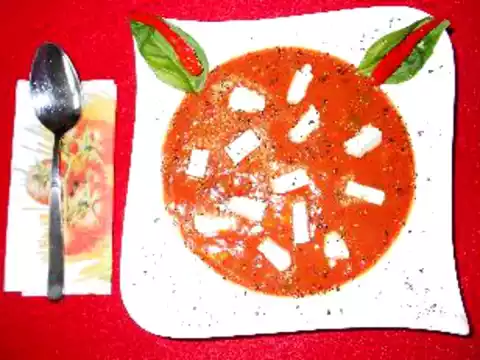 A little tip for the special kick: I always add a few cubes of feta cheese during the arrangement, not only does it look great but also gives the paprika-chili-soup a very special touch... and of course a fresh ciabatta should not be missing... GOOD APPETIT ;-)
