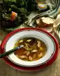 Season to taste with salt and pepper. Cut chicken into small pieces and add to the soup. Wash and finely chop the parsley. Pour soup into the plates. Place 1 teaspoon of crème fraîche in the middle of each plate and pull apart with a wooden skewer.