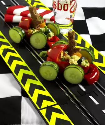 Fill the lower peppers with the rice salad. Put the cucumber steering wheel on in front. Put the "driver" into the salad. Place 2 cucumber wheels on each side. Put on the spoiler and hood. Serve any remaining salad with it