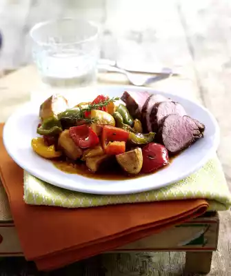 Wrap meat in aluminium foil and let it rest for about 5 minutes. Dissolve the meat with 4-5 tablespoons of water and pour the meat juice from the pork tenderloin into the vegetables. Season to taste. Cut the meat open, arrange everything.