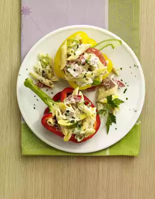 Drain the noodles and rinse under cold water. Mix yoghurt, herbs and ham-leek salad. Add the pepper strips and noodles and season to taste with salt, pepper and paprika powder. Fill the salad into the pepper halves and garnish with parsley leaves