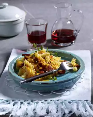 Add sausage, season with salt, pepper, sugar and marjoram. Arrange noodles and sauce on plates. Garnish with marjoram.