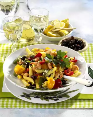 Stir the prawns, olives and remaining herb butter into the vegetables. Season to taste. Drain the pasta and put it back into the pot. Mix the vegetables with the noodles. Arrange, garnish