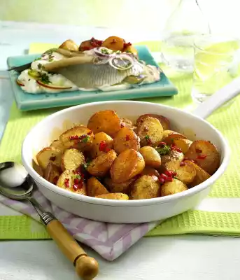 Add apples, onions, cucumbers and parsley, except for a little bit for sprinkling, to the sour cream and season with pepper and some sugar. Fold diced peppers into the potatoes. Season with salt, pepper and paprika powder. Sprinkle with parsley. Rinse the maties and dab dry. Arrange potatoes, housewife sauce and matie on plates. Garnish with red onion rings
