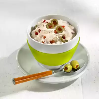 Mix quark, olive oil and aiwar. Season with salt and sugar. Stir in diced paprika and olives. Arrange curd cheese in a bowl and garnish with olive slices