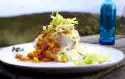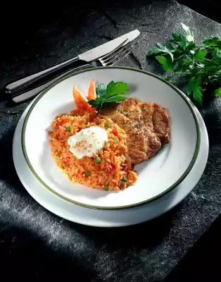 Season with salt and steak pepper. Arrange the rice with the neck chops on plates. Put crème fraîche and some paprika powder on the rice. Garnish with tomato and parsley.