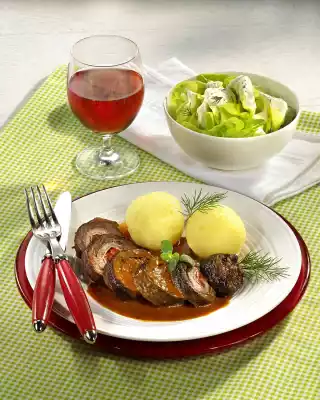 Dribble sauce over the salad. Remove roulades from the stock. Stir in the sauce thickener and refine with cream. Season to taste with salt and pepper. Arrange roulades with sauce, dumplings and salad. Serve garnished with fresh herbs