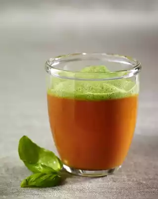 Fill 4 glasses (each with a capacity of approx. 300 ml) each with approx. 3/4 of the soup. Foam milk with a hand blender, add foam to the soup with a tablespoon. Froth the milk again and again until each glass is covered with foam