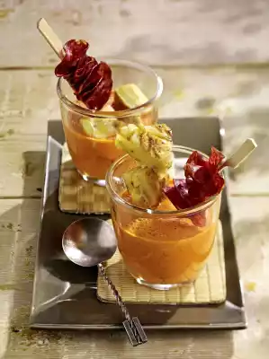 Cut the tortilla into pieces. Serve the soup with tortilla cubes and chorizo skewers.