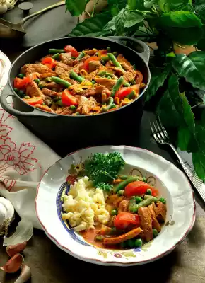 However, the meat should only braise in a little liquid. Wash the tomatoes, possibly skin them and cut them into slices. Add beans to the meat and braise for another 20 minutes. Add the tomatoes and peas 5 minutes before the end of the cooking time.