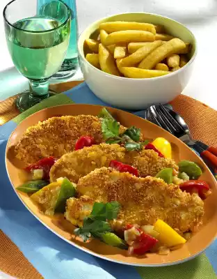 Add some water and cook covered for about 8 minutes. Season to taste with salt and pepper. Heat 3 tablespoons of oil in a pan. Fry the escalopes for about 10 minutes, turning them from time to time. Arrange the schnitzel with the paprika vegetables on a plate and garnish with parsley. Add the french fries