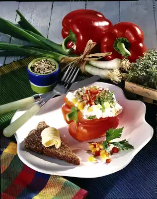 Fill the vegetable quark into the bell pepper. Roast the sunflower seeds without fat and sprinkle over the quark. Spread bread with fat and eat with it