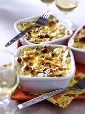 Cut the ham into small cubes. Grate parmesan. Cut lasagne sheets in half. Grease 4 small casseroles (11 x 11 cm; 4 cm high). Put 1 teaspoon of sauce into each dish. Place 1/2 lasagne dish on top, spread 1/3 of the mushrooms, ham and béchamel on top. Continue until everything is used up. Sprinkle with parmesan. Bake in a preheated oven (electric: 175 °C/ convection: 150 °C/ gas: see manufacturer) for 30-40 minutes