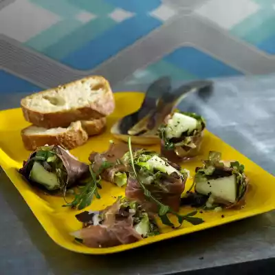 Use the rest of the melon for other purposes. Halve the slices. Clean, wash and shake the salad dry and cut into strips, except for some rocket for garnishing. Place the ham slices next to each other. Spread the lettuce on top, drizzle with some vinaigrette, wrap around 1/2 melon slices each, cut in half and arrange on a plate.