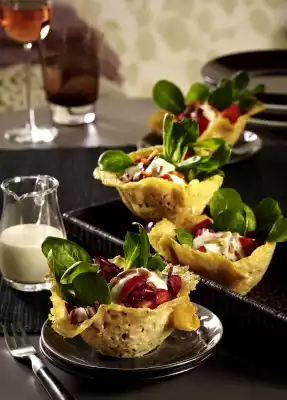 Cut baking paper into 6 squares (each approx. 20 x 20 cm). Place 2 squares each on a baking tray (approx. 33 x 40 cm). Finely grate the Parmesan cheese. Sprinkle a circle (approx. 14 cm Ø) in the middle of each square with approx. 50 g Parmesan cheese. Bake in the preheated oven (electric cooker: 200 °C/ circulating air: 175 °C/ gas: level 3) for 7-10 minutes (melt a little). Remove from the oven and, using the baking paper, immediately place parmesan circles over upside-down glasses or bowls. Remove the baking paper and carefully press the Parmesan circles on with the help of a tea towel. Let it cool down. Bake 4 more circles of the remaining Parmesan cheese one after the other and form them into baskets