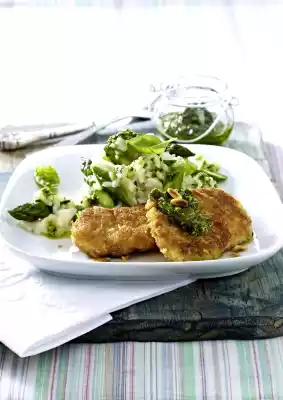 Whisk the eggs and season with salt and pepper. Turn the schnitzel first in the flour, then in the whisked eggs and finally in the breadcrumb mix.