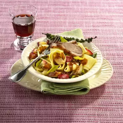 Remove duck breasts from the pan and keep warm. Sauté the apple, shallots, thyme and leek in the frying fat. Deglaze with duck stock and port wine. Simmer for 5 minutes. Add pepper to the sauce and bring to the boil. Stir in the sauce thickener and simmer for 1 minute. Season to taste with salt and pepper. Cut the duck breast into slices. Drain the pasta and let it drain. Mix everything together. Serve garnished with pepper pancake