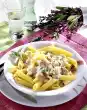 Season to taste with salt and pepper. Cut the duck breast into slices. Drain the pasta and let it drain. Mix everything together. Serve garnished with pepper pancake