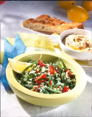 Mix the remaining lemon juice, onion, garlic, salt and pepper. Add 3 tablespoons of olive oil. Drain Bulgur well on a sieve. Mix the rocket, parsley, mint, tomatoes and bulgur and pour the marinade over it.