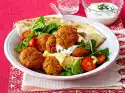 Arrange the salad in four small bowls, garnish with lemon wedges as desired. Drizzle the chickpea puree with the remaining olive oil and sprinkle with pink berries as desired. Serve in a small bowl.