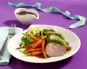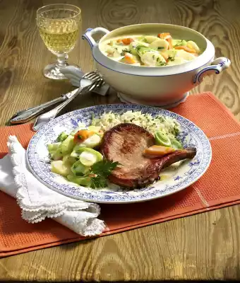 Pour the vegetables onto a sieve, collecting the vegetable water. Melt the fat in a pot. Sweat flour in it. Deglaze with 1/2 litre vegetable water and milk. Bring sauce to the boil. Season to taste with salt, pepper and lemon juice. Add vegetables to the sauce and keep warm. Wash the meat and dab dry. Heat oil in a pan. Fry the chops in it for about 3 minutes on each side.