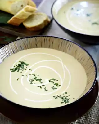 Mix crème fraîche with milk. Arrange soup in soup bowls. Pour the crème fraîche onto the surface using a spoon handle or the tip of a knife. Sprinkle with parsley and parsnip chips