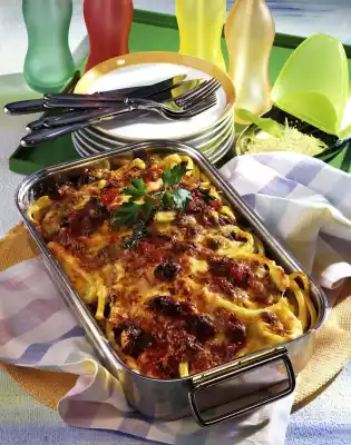 Pour off, quench and drain. Place the macaroni and sauce in a roasting pan (20x32 cm; approx. 2 1/4 litres capacity), finish with sauce. Coarsely grate the cheese, spread on the casserole and sprinkle with the cream.