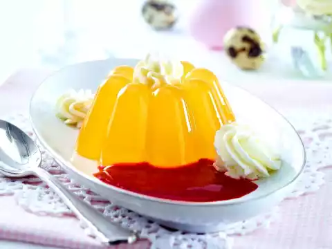 Defrost the raspberries and pass through a sieve. Stir in icing sugar. Whip the cream until stiff, fill into a piping bag with star-shaped spout. Dip the jelly moulds briefly in hot water and remove the jelly from the moulds. Arrange raspberry puree, jelly and cream.