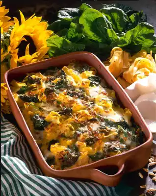 Pour some chopped spinach mixture and noodles into a casserole dish. Spread half of the mozzarella on top. Pour in the remaining ingredients and cover again with slices of mozzarella. Sprinkle with pine nuts.