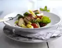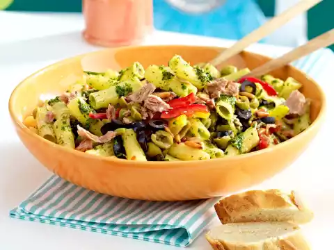 Drain the olives and tuna. Coarsely chop the olives. Roast pine nuts and let them cool down. Clean, wash and cut the peppers into strips. Mix everything and the rest of the salsa with the noodles, season to taste.