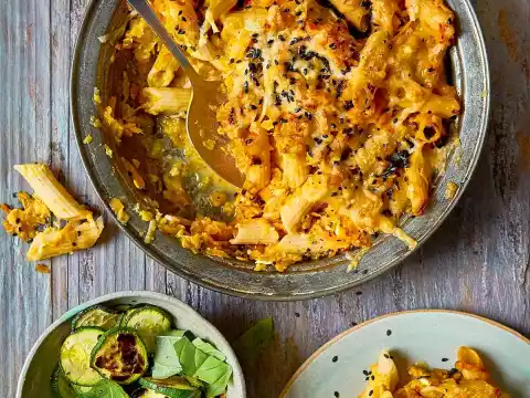 Fold in the pasta. Grate cheese. Pour the pasta mixture into an ovenproof dish (approx. 16 x 20 cm) and smooth it down with the back of a spoon. Sprinkle with sunflower seeds, cheese and, if used, sesame seeds. Bake under the grill for about 5 minutes.