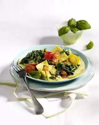 Drain the ravioli, drain thoroughly and also fold into the spinach. Season to taste with salt and pepper. Arrange the ravioli on preheated plates and garnish with basil.