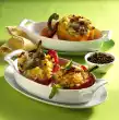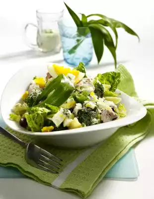 Season to taste with sugar. Stir in wild garlic and fold in oil. Mix vinaigrette and yoghurt and season again with salt, pepper and sugar. Cut the eggs into slices (put one slice of ice aside for garnishing), then chop roughly. Coarsely crumble the tuna. Mix the pasta, broccoli, olives, romaine lettuce, eggs and yoghurt vinaigrette and leave to stand for a while. Arrange in a bowl and garnish with ice cream and wild garlic