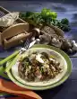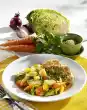 Cook the eggs in boiling water for about 9 minutes, drain, quench and remove the shell. Cool the eggs. Clean, wash, drain and cut salad into strips. For the sauce, peel and finely dice the onion. Wash wild garlic, shake dry (put one leaf aside for garnishing) and cut into fine strips. Mix vinegar, onion, salt and pepper. Season to taste with sugar. Stir in wild garlic and fold in oil. Mix vinaigrette and yoghurt and season again with salt, pepper and sugar. Cut the eggs into slices (put one slice of ice aside for garnishing), then chop roughly.