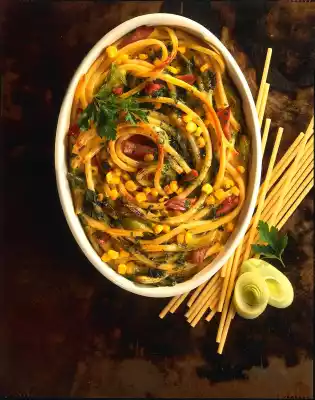 Add parsley. Season with salt and pepper. Mix noodles with leek, ham and corn. Put them into an ovenproof dish. Pour herbal egg milk over it and bake in the preheated oven (electric cooker: 200 °C/ gas: level 3) for approx. 45 minutes