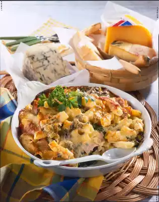 Season with salt and pepper. Cut ham into strips. Mix the prepared ingredients and fill into a greased casserole dish. Set aside 2 slices each of gorgonzola, raclette and gouda cheese. Grate the remaining cheese. Melt the fat and sauté the flour in it until golden brown. Deglaze with white wine, stock and milk. Bring to the boil while stirring. Stir the grated cheese into the sauce and let it melt. Season to taste with salt and pepper. Spread evenly over the casserole. Cover with cheese slices and sprinkle with grated Parmesan cheese.