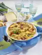 Deglaze with white wine, stock and milk. Bring to the boil while stirring. Stir the grated cheese into the sauce and let it melt. Season to taste with salt and pepper. Spread evenly over the casserole. Cover with cheese slices and sprinkle with grated Parmesan cheese. Bake in a preheated oven (electric: 200 °C/ gas: level 3) for about 20 minutes until golden brown. Serve garnished with herb bouquets